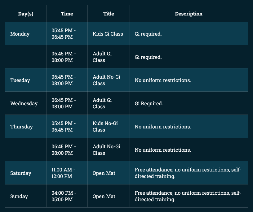 WEEKLY TRAINING SCHEDULE please see the following weekly training schedule for Youth and Adult classes. Please note that class times are subject to changes and cancellations. To stay updated on any changes, be sure to join our WhatsApp group.